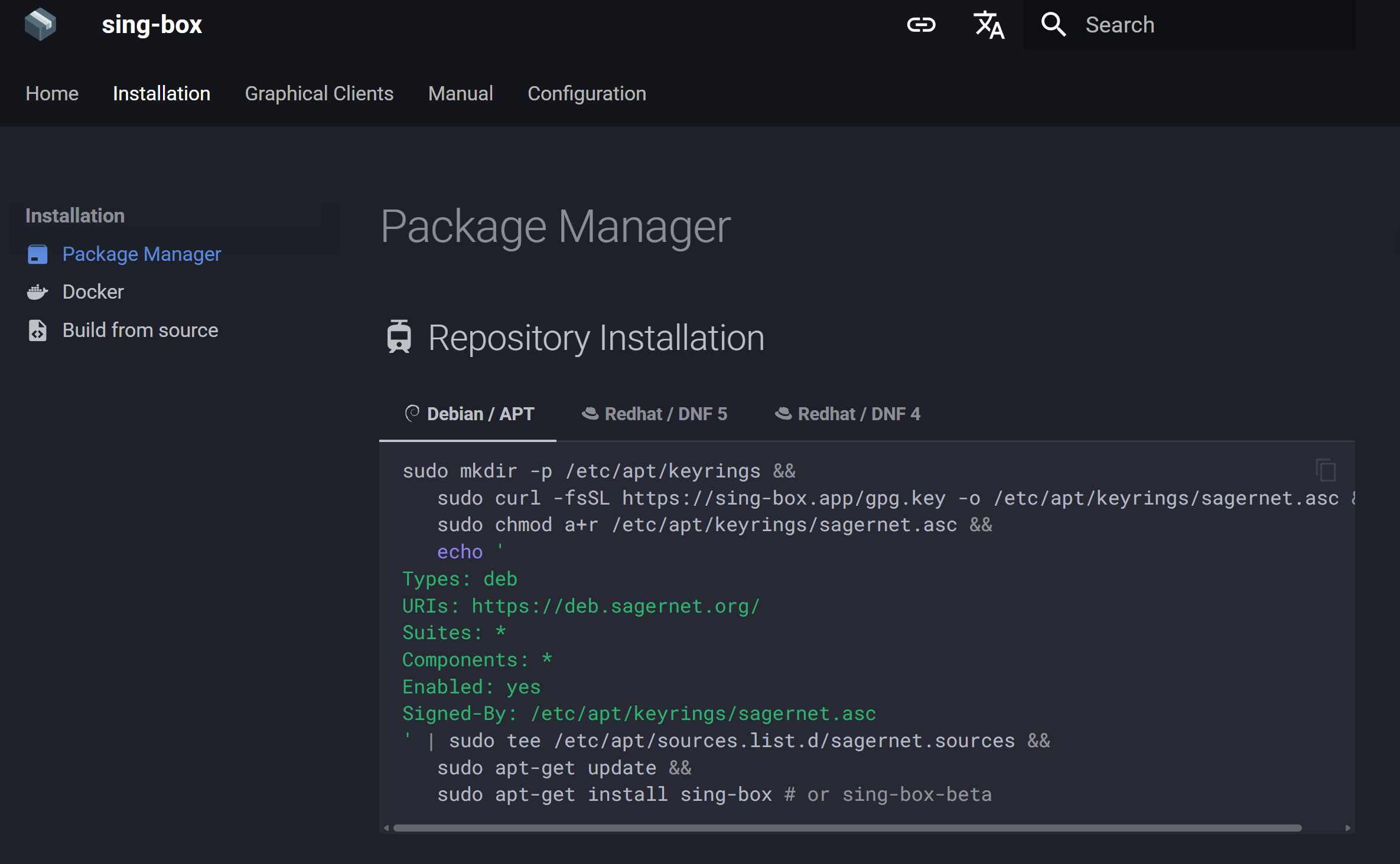 sudo mkdir -p /etc/apt/keyrings && sudo curl -fsSL https://sing-box.app/gpg.key -o /etc/apt/keyrings/sagernet.asc && sudo chmod a+r /etc/apt/keyrings/sagernet.asc && echo ' Types: deb URIs: https://deb.sagernet.org/ Suites: * Components: * Enabled: yes Signed-By: /etc/apt/keyrings/sagernet.asc ' | sudo tee /etc/apt/sources.list.d/sagernet.sources && sudo apt-get update && sudo apt-get install sing-box # or sing-box-beta