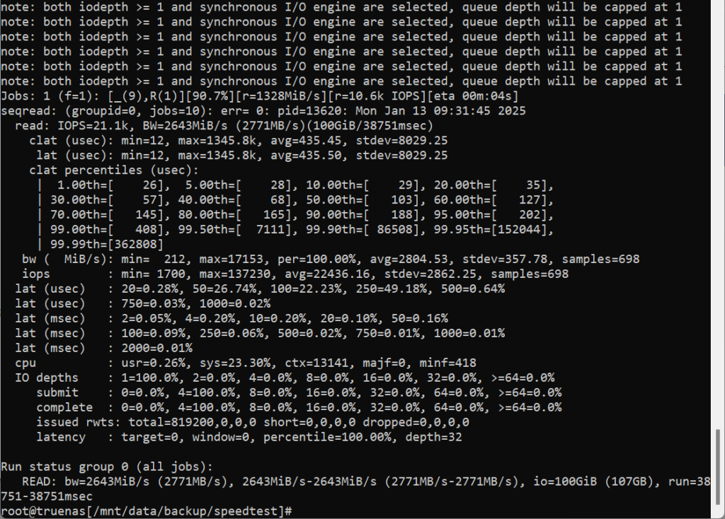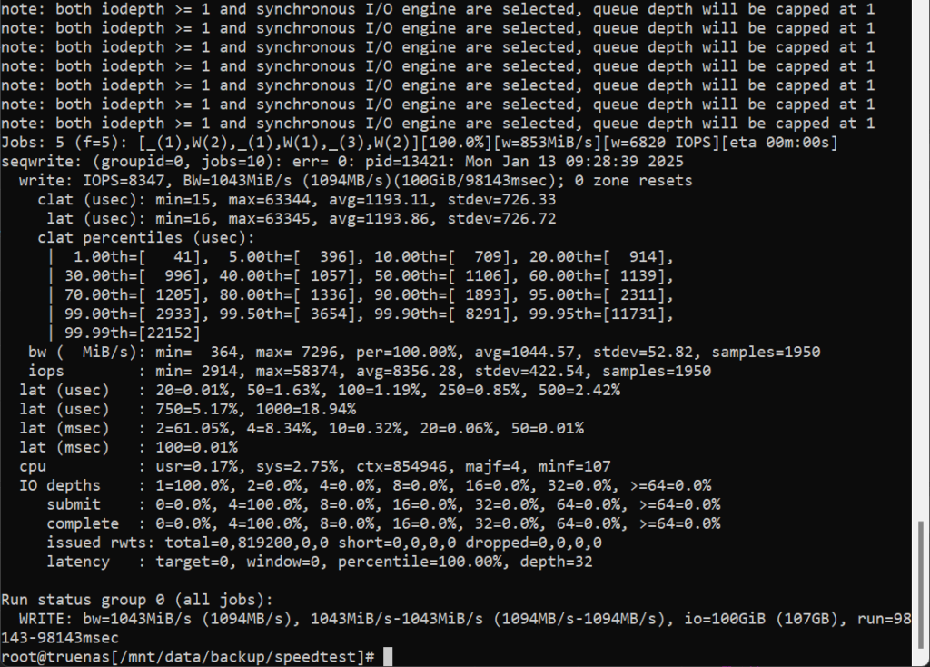 cd /mnt/data/dataset mkdir speedtest cd speedtest //下面是顺序写测试 fio --name=seqwrite --rw=write --direct=1 --ioengine=psync --bs=128k --iodepth=32 --numjobs=10 --size=10G --group_reporting //下面是顺序读测试 fio --name=seqread --rw=read --direct=1 --ioengine=psync --bs=128k --iodepth=32 --numjobs=10 --size=10G --group_reporting