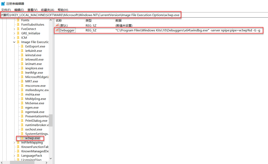添加名为w3wp.exe的项,并在右侧添加名为“Debugger”的字符串类型数据,数据内容为