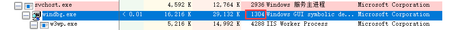 这里要记住的是调试器的PID,而不是w3wp.exe的PID,图中PID为1304。