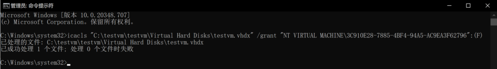 icacls "C:\testvm\testvm\Virtual Hard Disks\testvm.vhdx" /grant "NT VIRTUAL MACHINE\3C910E28-7885-4BF4-94A5-AC9EA3F62796":(F)