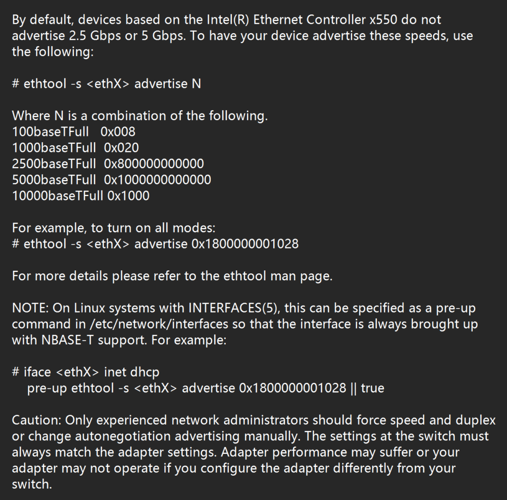 Windows自带的X550驱动是支持2.5G、5G自动协商的,但是较新的intel官方驱动是不支持的。这会导致使用较新的intel驱动时,X550网卡插在2.5G交换机上,会反复丢失连接(网卡在红叉和连线状态反复横跳)。在Windows平台上解决起来比较方便,直接在网卡设置里设定速度就可以了。