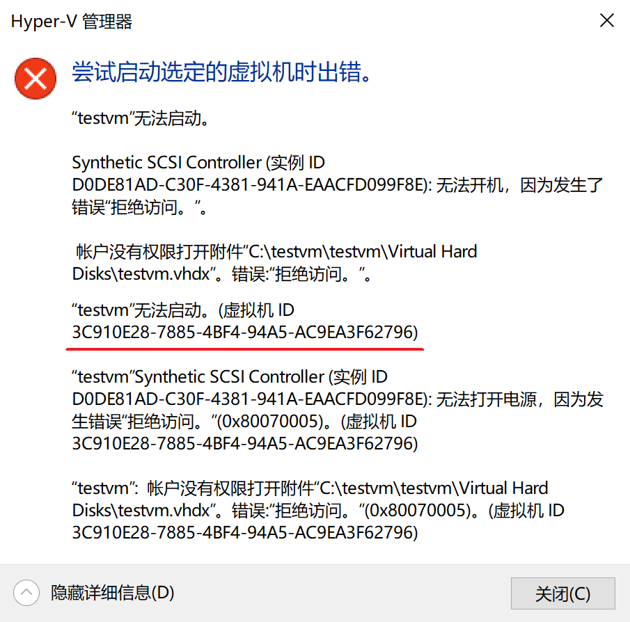 当我们移动hyper-v虚拟机到新磁盘后,启动虚拟机是会出现下面的提示,意思就是虚拟机的磁盘文件没有权限,只需要用命令行给虚拟磁盘文件添加权限即可解决。