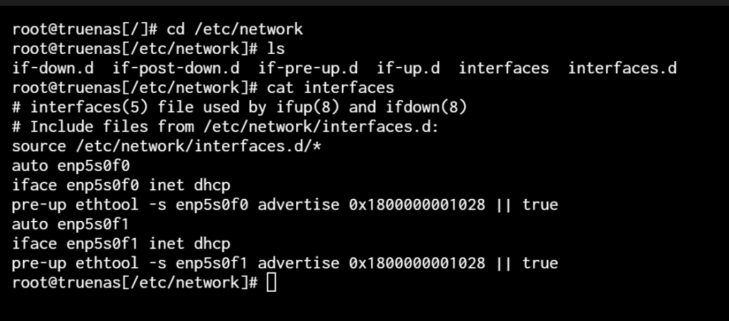 root@truenas[/]# cd /etc/network root@truenas[/etc/network]# ls if-down.d if-post-down.d if-pre-up.d if-up.d interfaces interfaces.d root@truenas[/etc/network]# cat interfaces # interfaces(5) file used by ifup(8) and ifdown(8) # Include files from /etc/network/interfaces.d: source /etc/network/interfaces.d/* auto enp5s0f0 iface enp5s0f0 inet dhcp pre-up ethtool -s enp5s0f0 advertise 0x1800000001028 || true auto enp5s0f1 iface enp5s0f1 inet dhcp pre-up ethtool -s enp5s0f1 advertise 0x1800000001028 || true root@truenas[/etc/network]#