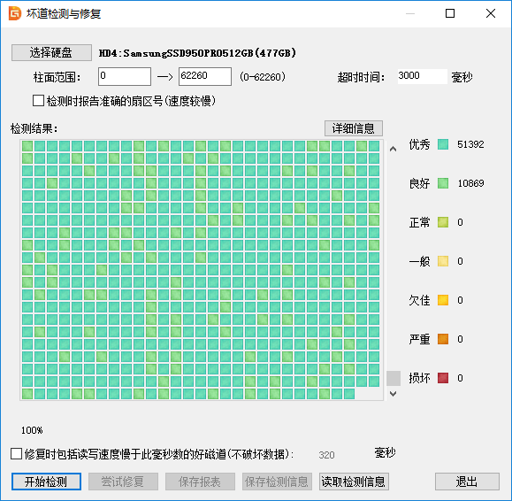 发现一个问题,硬盘剩余空间比较大的时候,坏道测试结果看着比较健康;硬盘快存满的时候,坏道测试结果看着就没那么健康了。