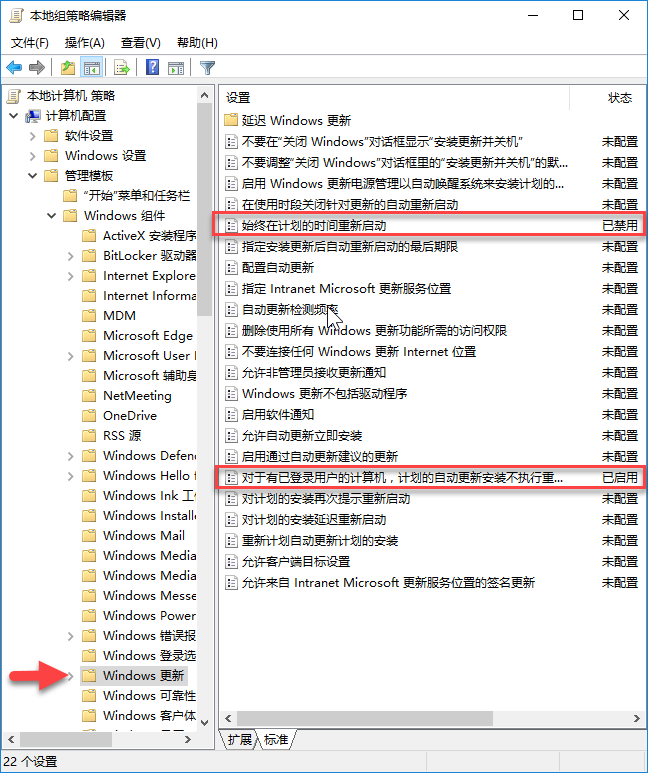 Windows10的更新重启机制真是蛋疼,在设置界面里是无法关闭的。系统给出的解决方案是,设定一个计算机工作时间,待到自动更新完毕后,会在工作时间以外的时间重启计算机。然而这个工作时间只能设置12个小时的长度。要想彻底关闭自动更新的计划重启机制,就得改组策略。