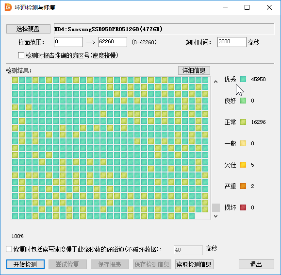 发现一个问题,硬盘剩余空间比较大的时候,坏道测试结果看着比较健康;硬盘快存满的时候,坏道测试结果看着就没那么健康了。