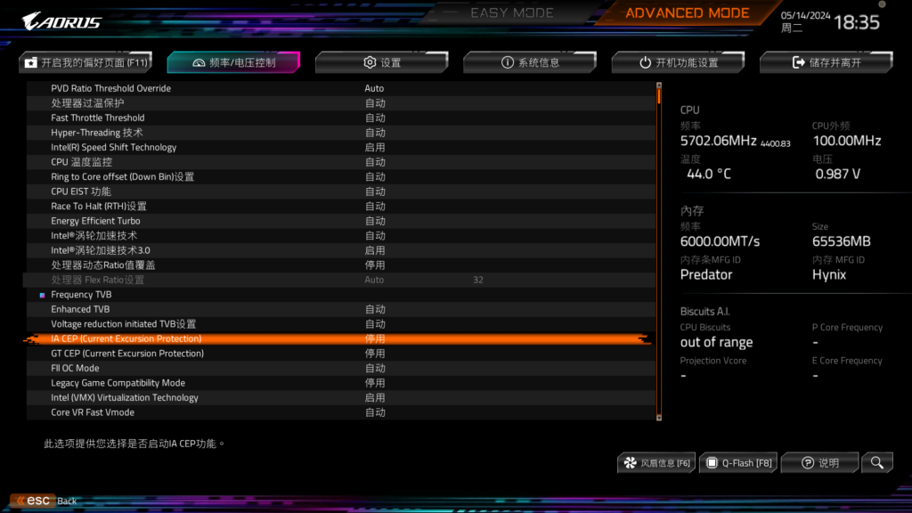 在BIOS中停用“IA CEP(Current Excursion Protection)”和“GT CEP(Current Excursion Protection)”两个选项即可。